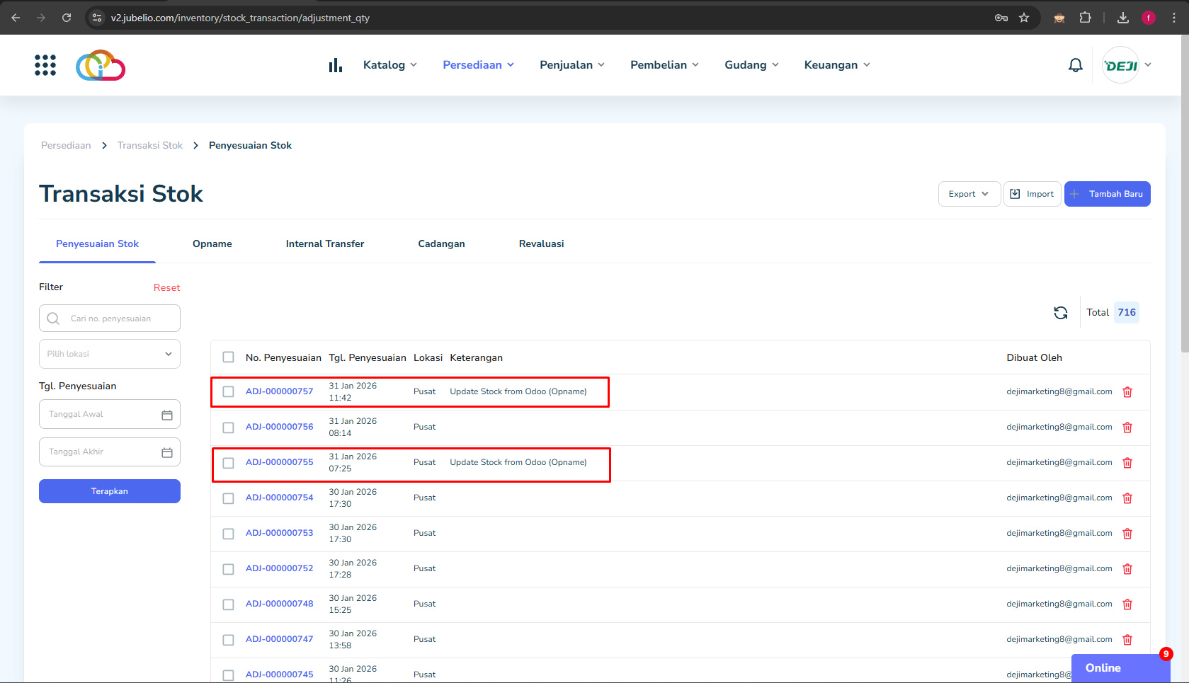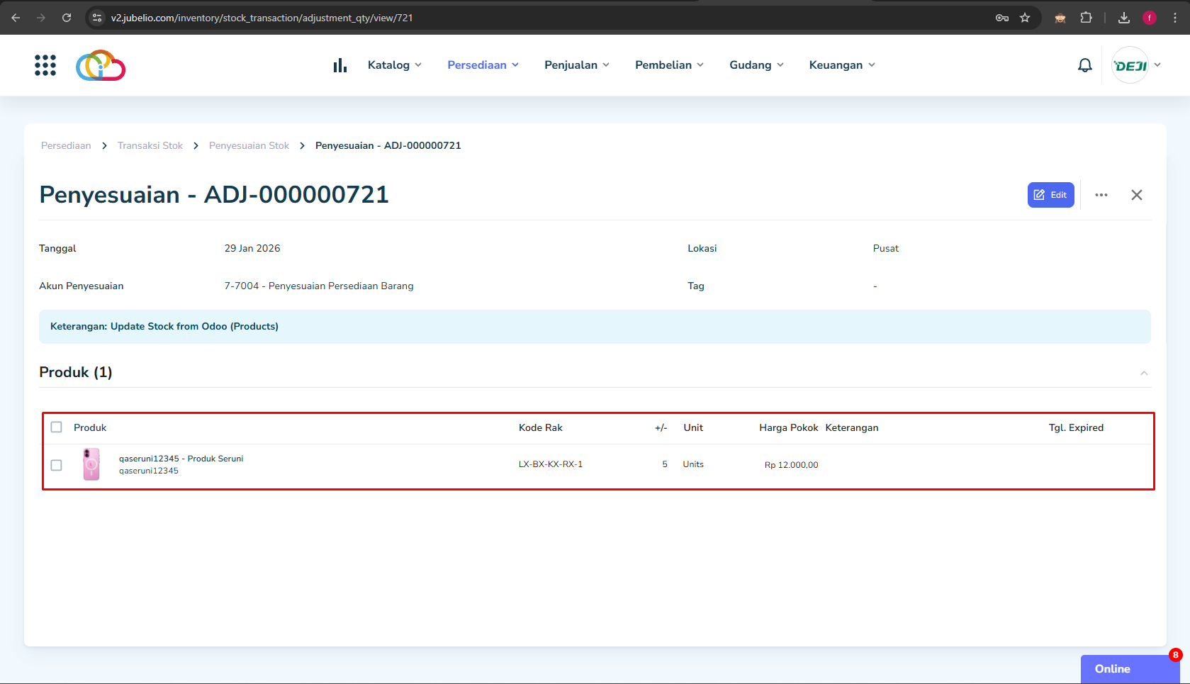 - Jika pada kolom keterangan terdapat text "Update Stock From Odoo" menandakan terdapat transaksi/adjusment yang dilakukan di Odoo