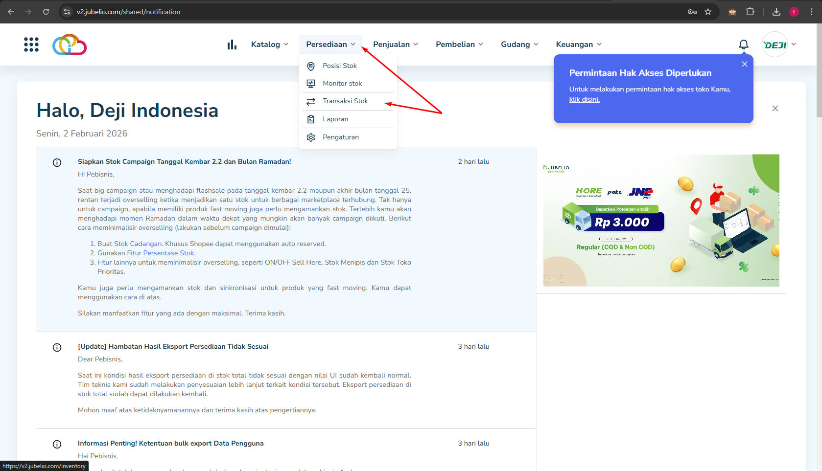 - Klik Menu Persediaan lalu pilih Transaksi Stok
